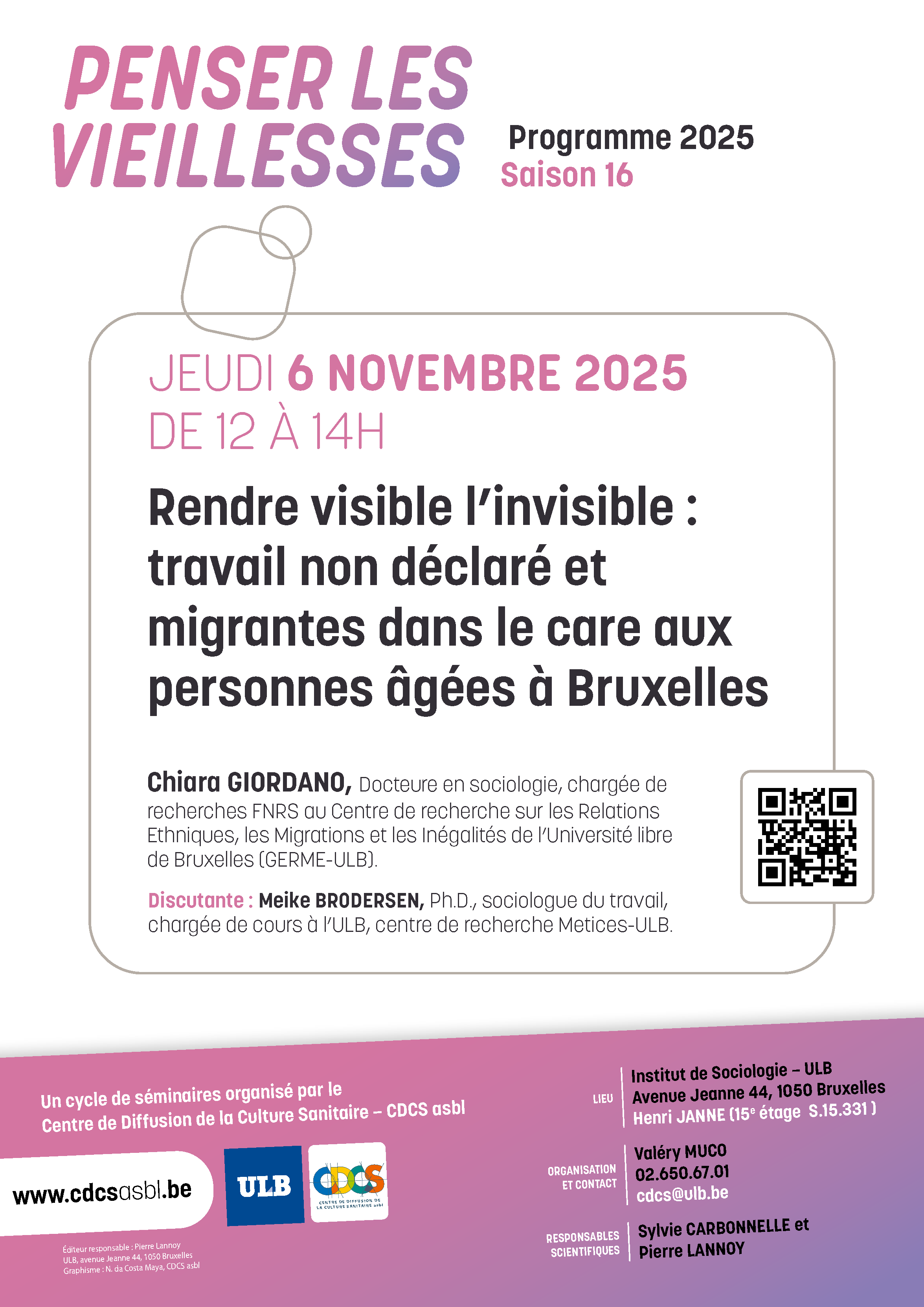 Le jeudi 6 novembre 2025, le CDCS accueille Chiara GIORDANO qui présentera les résultats d’une enquête menée entre 2018 et 2022 à Bruxelles sur le travail non déclaré dans le secteur du care aux personnes âgées, un sujet encore largement négligé par la littérature académique.