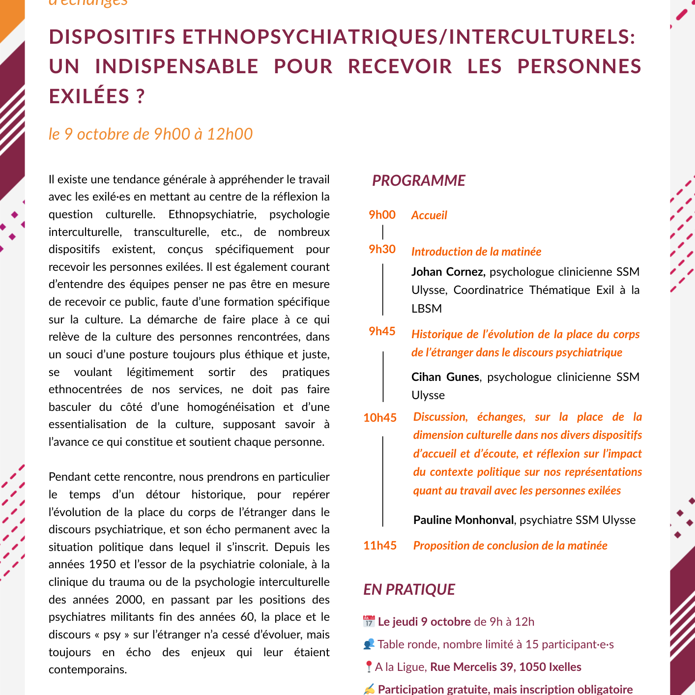 Dans le cadre de la Semaine de la Santé Mentale, La Ligue Bruxelloise pour la Santé Mentale et le Service de Santé Mentale Ulysse co-organisent une matinée d’échanges Dispositifs ethnopsychiatriques/interculturels : un indispensable pour recevoir les personnes exilées ? le 9 octobre de 9h à 12h, dans les locaux de la Ligue.