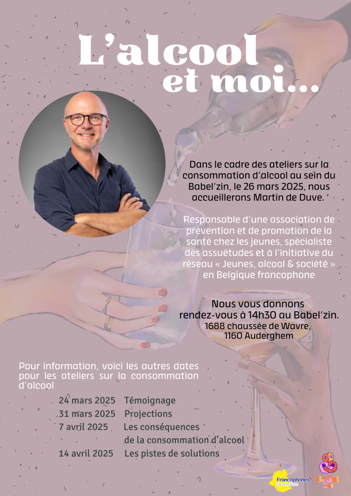 Toujours dans le cadre de ce cycle d’ateliers, nous accueillerons Martin de Duve, expert en santé publique, spécialiste des assuétudes et à l’initiative du réseau « Jeunes, alcool & société » en Belgique francophone. Ce moment de rencontre aura lieu le mercredi 26 mars, de 14h30 à 16h. Que vous soyez professionnelles, aidantes proches ou simplement concernées/intéressées par les questions de consommation, vous êtes les bienvenues.