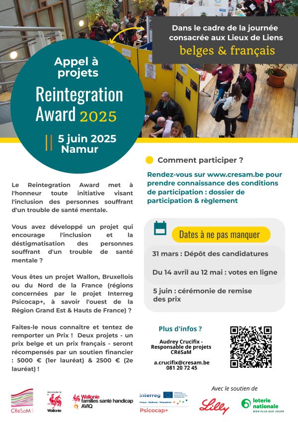 Le Reintegration Award met à l’honneur chaque année toute initiative visant l’inclusion des personnes vivant avec un trouble mental et la déstigmatisation en santé mentale. La réhabilitation psycho-sociale, associée au traitement, va aider les patients psychiatriques à optimiser leurs ressources pour pouvoir vivre leur vie dans la communauté et y avoir leur place, comme tout le monde. C’est un engagement de tous les jours, à mener avec les usagers, leur entourage, les professionnels et la société dans son ensemble, un pari pour arriver à changer l’image de la santé mentale.