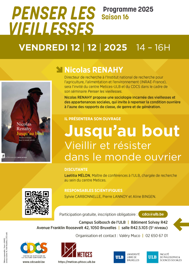 Nicolas RENAHY, sociologue et spécialiste des classes populaires et des mondes ruraux, auteur de l’ouvrage Jusqu’au bout. Vieillir et résister dans le monde ouvrier, sera l’invité du centre Metices-ULB et du CDCS dans le cadre de son séminaire Penser les vieillesses le vendredi 12 décembre 2025.