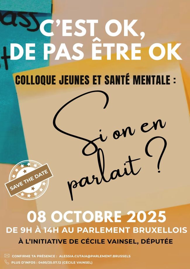 J’ai le grand plaisir de vous inviter à participer à la date du mercredi 8 octobre 2025 à notre colloque « Jeunes et santé mentale », organisé de 9H à 14H, dans l’hémicycle du Parlement bruxellois à l’initiative de Cécile Vainsel, députée bruxelloise.