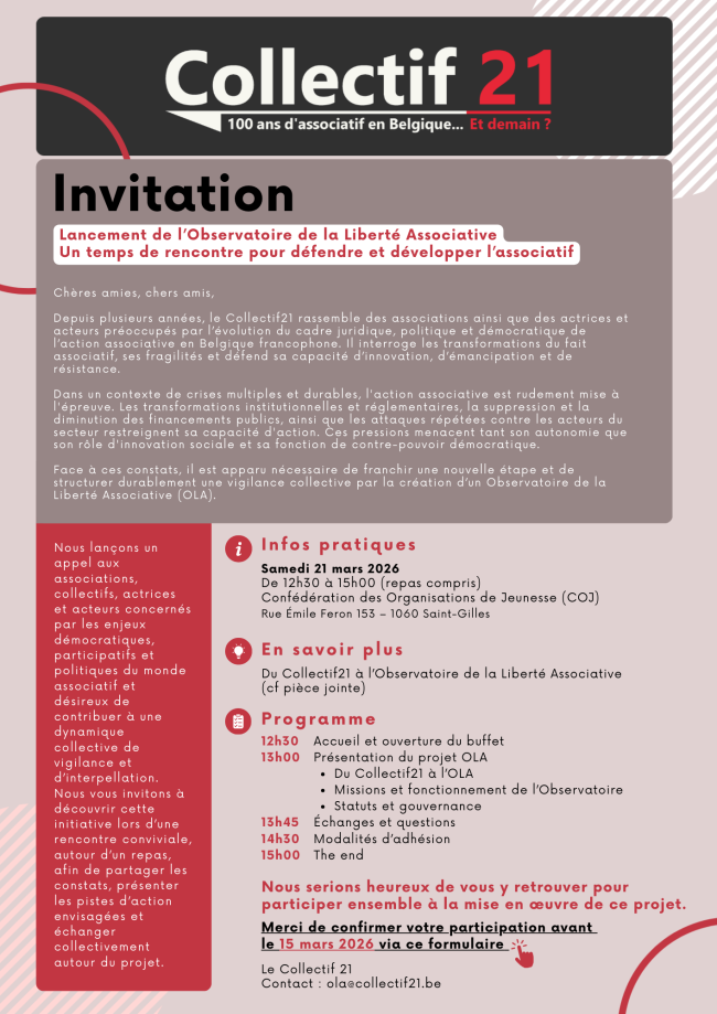 Depuis plusieurs années, le Collectif 21 rassemble des associations ainsi que des actrices et acteurs préoccupés par l’évolution du cadre juridique, politique et démocratique de l’action associative en Belgique francophone. Il interroge les transformations du fait associatif, ses fragilités et défend sa capacité d’innovation, d’émancipation et de résistance.