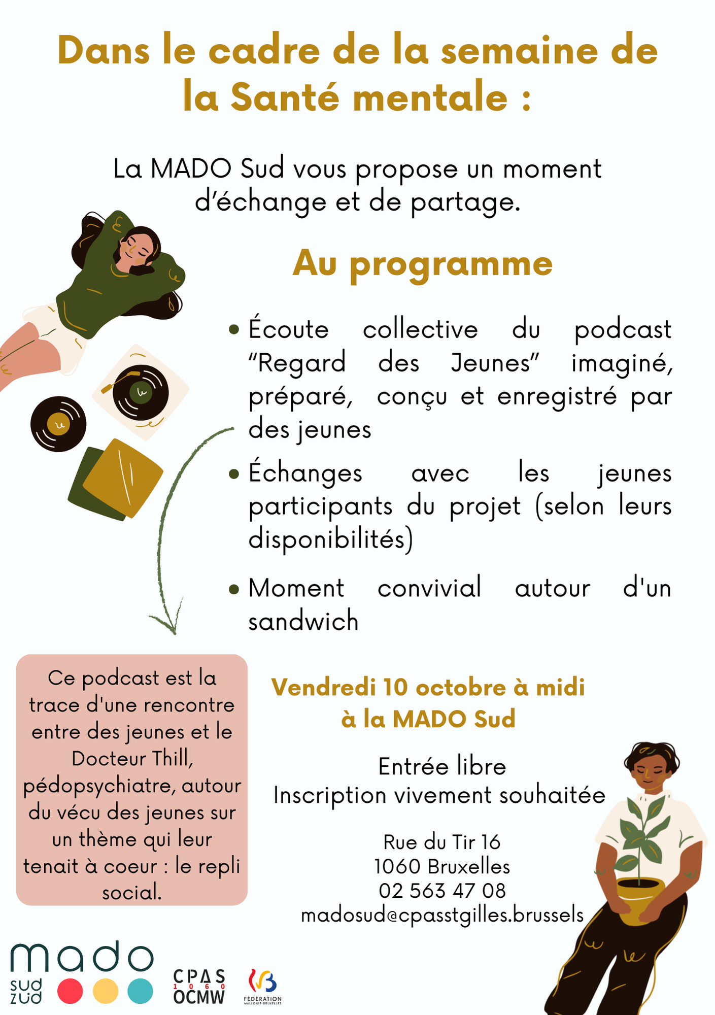 Dans le cadre de la semaine en santé mentale, la MADO Sud ouvre ses portes et propose une écoute collective du podcast imaginé, préparé, conçu et enregistré par des jeunes, soutenuMADO Sud et de leur partenaire « Indications Asbl ». es par l’équipe de la