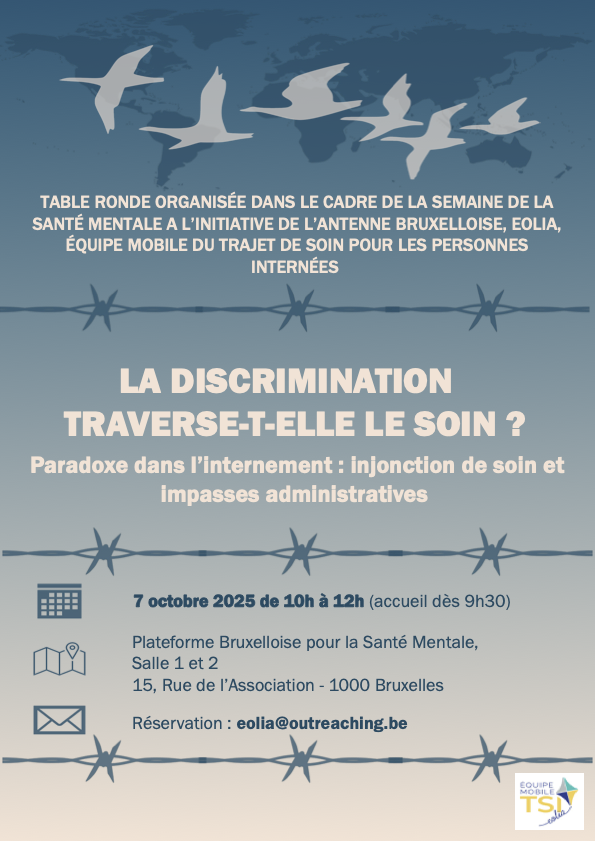 Dans le cadre de la Semaine de la Santé Mentale, l’équipe mobile Eolia organise une table ronde : La discrimination traverse-t-elle le soin ? Paradoxe dans l’internement : injonction de soin et impasses administratives, le 7 octobre de 9h30 à 12h30.