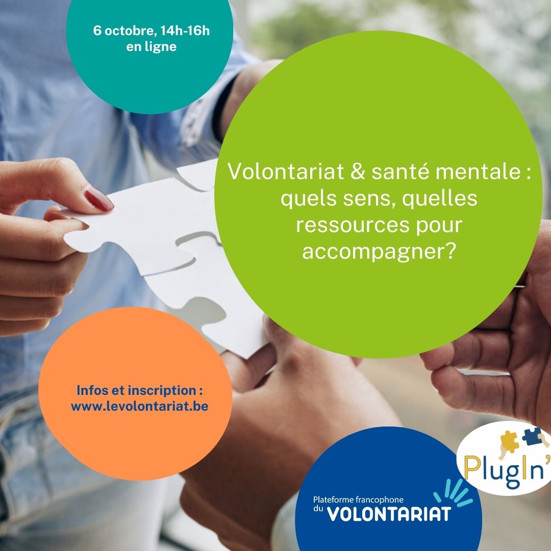 Dans le cadre de la Semaine de la Santé Mentale, vous êtes invité à une rencontre organisée par la PFV en partenariat avec la cellule Volontariat « PlugIn’ » (Plateforme Bruxelloise pour la Santé Mentale). Lors de cette rencontre en ligne venez :