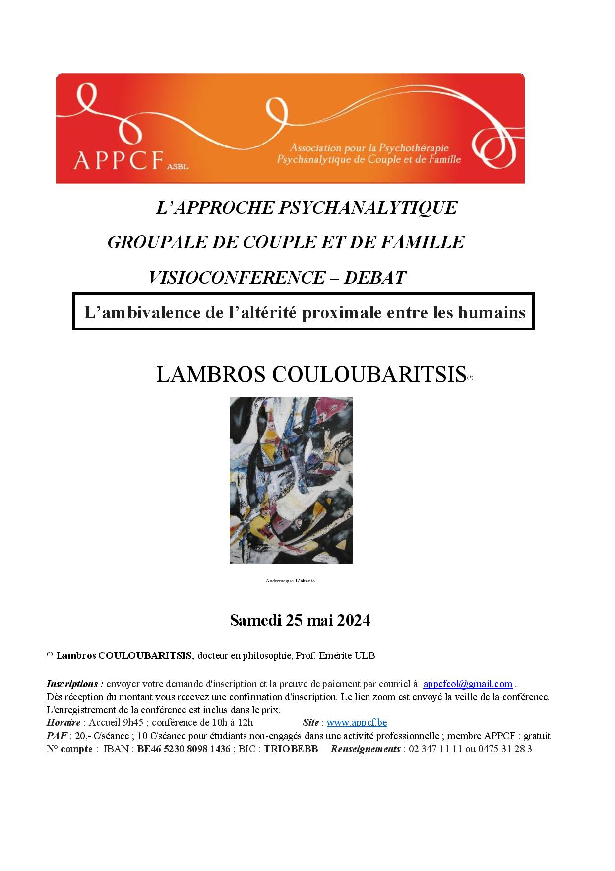 L’Association pour la Psychothérapie Psychanalytique de Couple et de Famille (APPCF) organise le samedi 25 mai une visioconférence intitulée « L’ambivalence de l’altérité proximale entre les humains » par Lambros Couloubaritsis, docteur en philosophie, Prof. Emérite ULB ; de 9h45 à 12h ; P.A.F. : 20,-€ (étud : 10 €) ; Inscr. : appcfcol@gmail.com ;